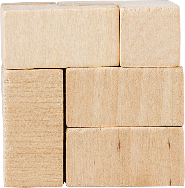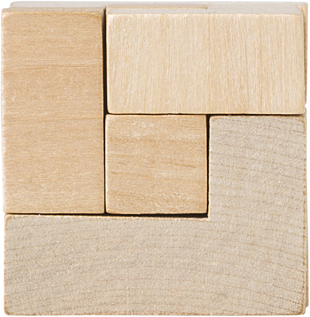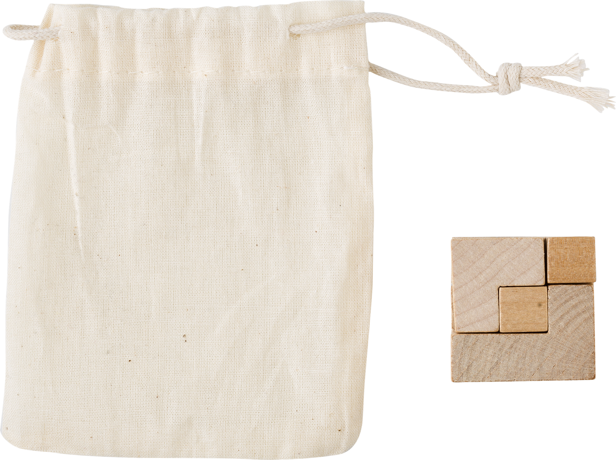Wooden cube jigsaw puzzle. Packaged in cotton pouch.